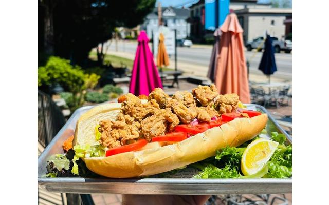 Let's do this, April 14th. Virginia Oyster Po' Boy Salt & Pepper Fried Virginia Oysters-Footlong Local Hoagie Roll-Duke's Mayo-Roma Tomato-Shaved Romaine-Purple Onion-One Side $21